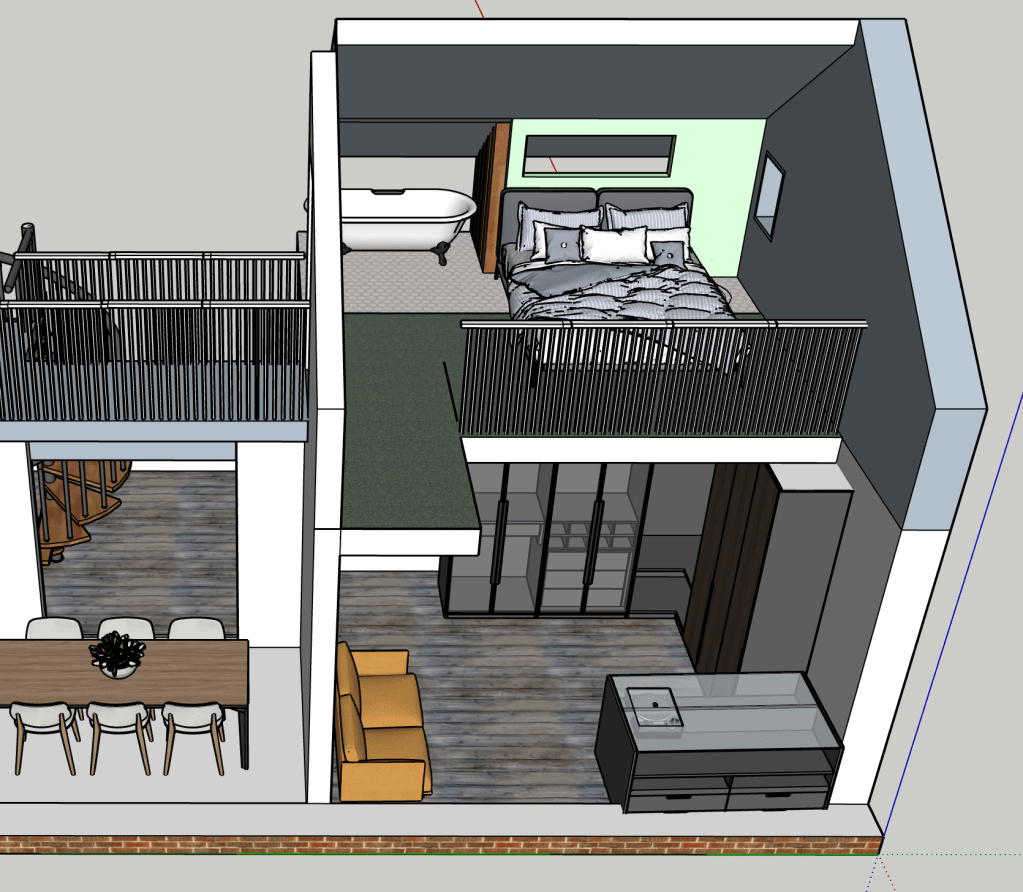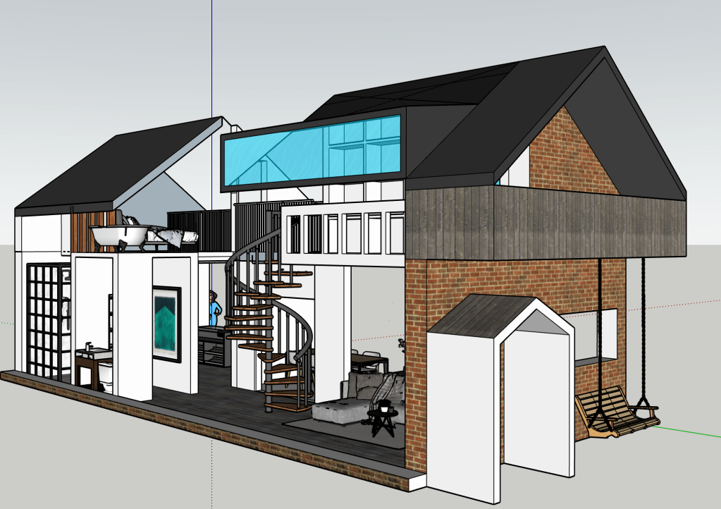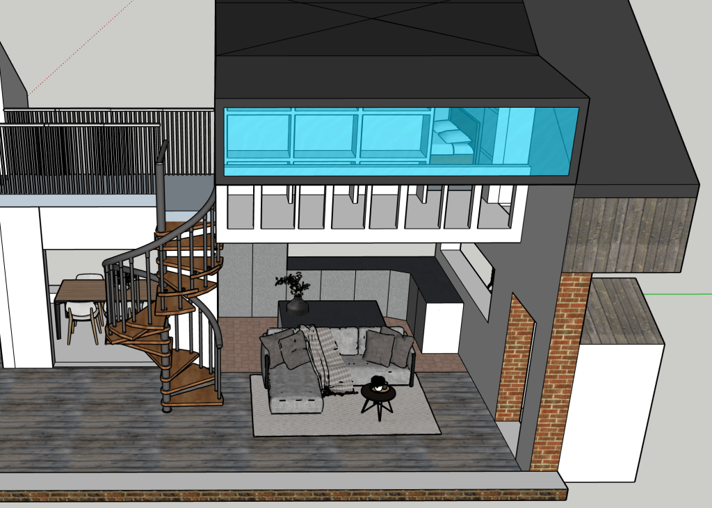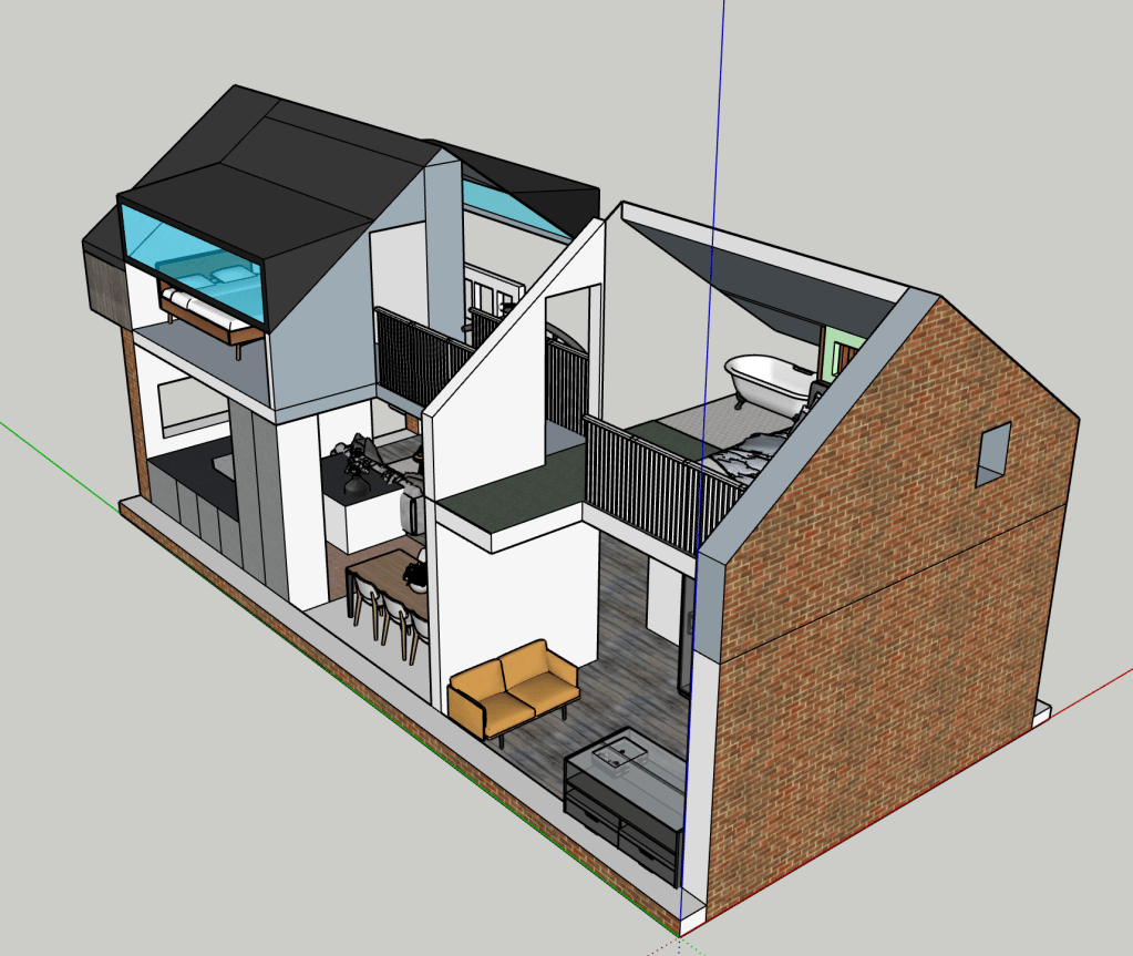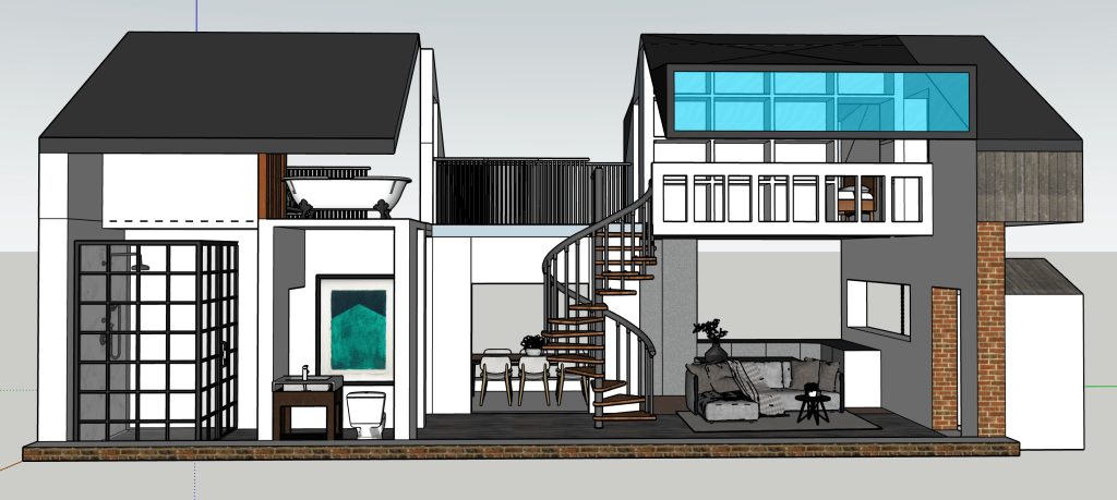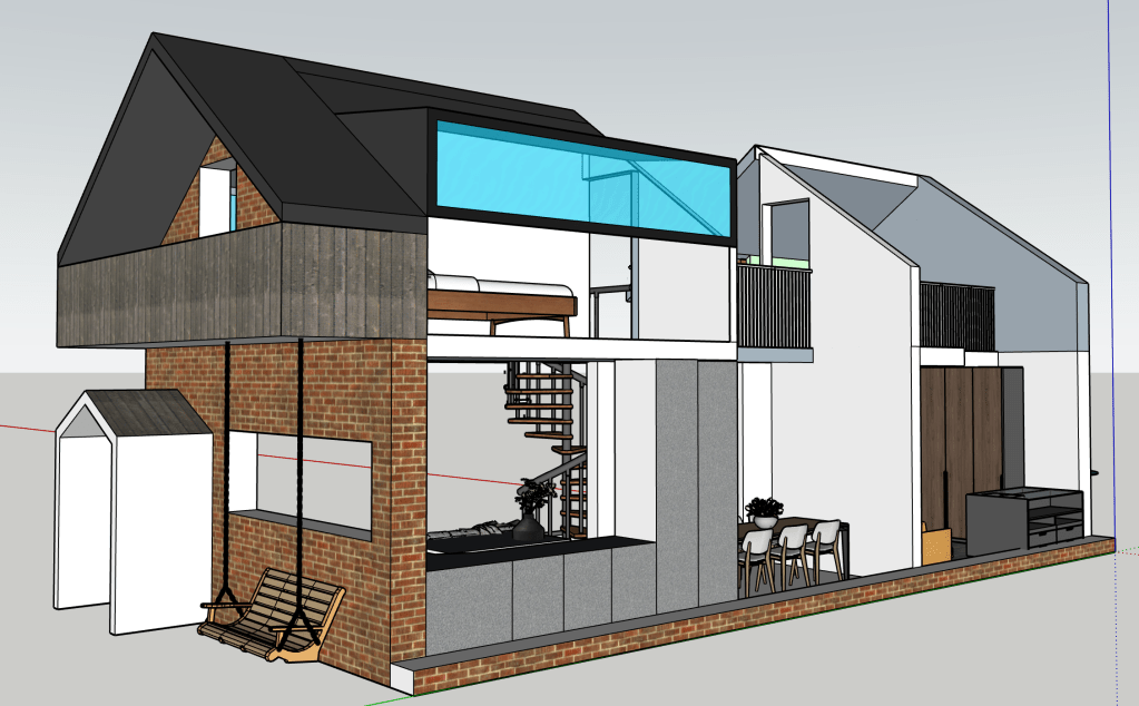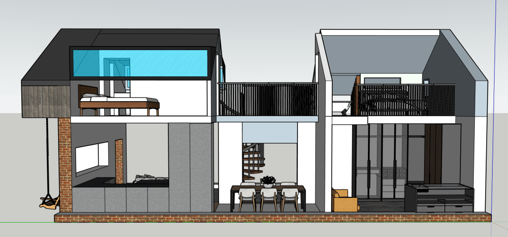 Sometimes I just like designing spaces. I have always wanted to build a house, so I’m always designing houses. This is smaller and more modest than the big house with the central atrium. It seems a smarter use of space and a more realistic and humble home I guess. I’m always striving for a double height brick wall courtyard garden. I’m good at visualising space. I can walk it in my head with ease and it’s a place I like to hangout. The concept with this house was connected space. To perhaps be able to hear but not see the inhabitants when they are using the space.